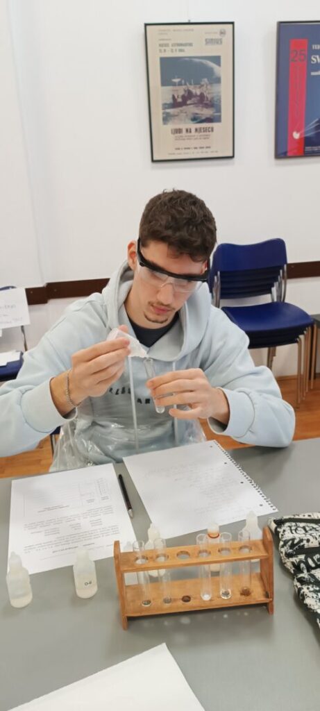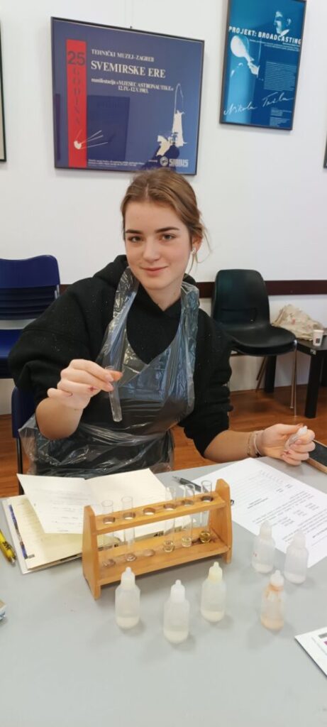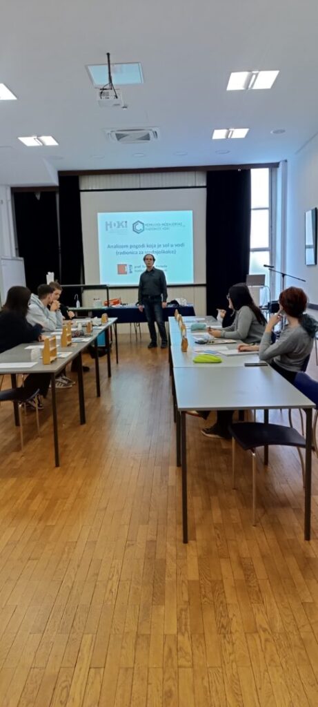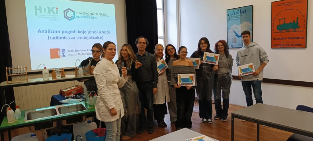 U utorak, 9. prosinca, u sklopu aktivnosti našega školskog projekta „Prijepodne kemija”, sudjelovali smo u radionici iz kemije pod nazivom „Analizom pogodi koja je sol u vodi”. Radionica je dio ciklusa Kemijsko-inženjerskih radionica Hrvatskog društva kemijskih inženjera i tehnologa (HDKI), a održana je u maloj dvorani Tehničkog muzeja Nikola Tesla. Vodio ju je njezin autor, izv. prof. dr. sc. Tomislav Portada, kemičar i popularizator znanosti s Instituta Ruđer Bošković, s kojim naša škola već dugi niz godina uspješno surađuje.