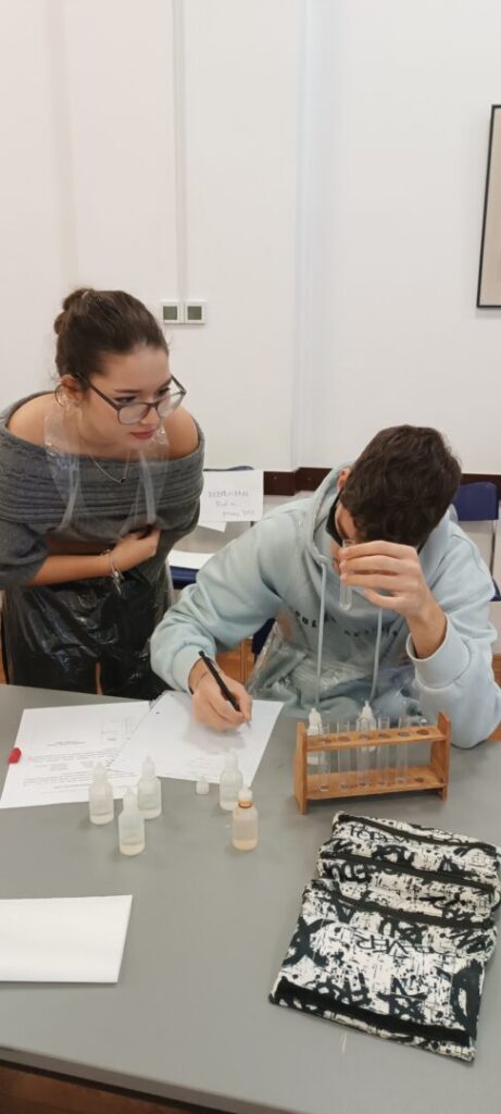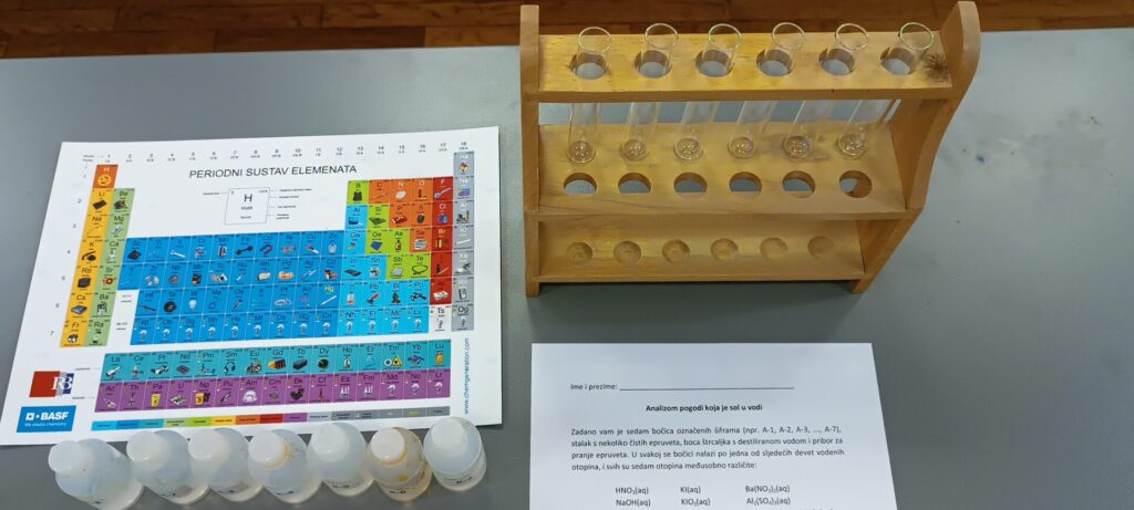 Radionica je započela uvodnim predavanjem prof. Portade, nakon čega je uslijedio individualni praktični rad učenika koji je ukupno trajao tri školska sata. Profesor Portada osmislio je radionicu prema zadatku s Međunarodne kemijske olimpijade 2016. godine, održane u Gruziji, a do danas je u sklopu aktivnosti HDKI-ja izvedena u brojnim školama i gradovima diljem Hrvatske. Učenici su, pažljivim miješanjem otopina i opažanjem njihovih reakcija, trebali otkriti sastave nepoznatih vodenih otopina u plastičnim bočicama.